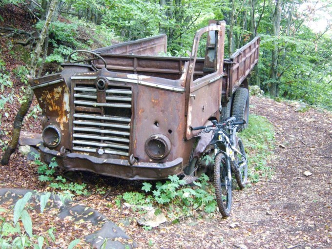 Vorbei an den Überresten des Forte Cherle und der alten Treppe "Scala Imperatore" geht es zum Monte Maggio. Auch hier oben wurde überall gekämpft und Stellungen gebaut. Die Abfahrt ist toll, aber schwer. Teilweise muss ich tragen, insbesondere weil noch alles nass und glitschig ist. Am Bocchetta Campiglia komme ich dann nicht mehr weiter, die alte Militärstraße zum Dente Italiano ist wegen Steinschlaggefahr gesperrt. Ich nehme deshalb die Straße bis Rovereto.