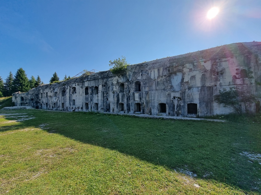 Zunächst fahre ich auf einem Forstweg hoch zur Malga Tognola, wo ich eine Mountain-Bike Gruppe treffe und überhole. Die Abfahrt hinunter ins Tal ist ein schöner Trail, der extra für Mountain-Bike-Fahrer mit Holzbrückchen so angelegt wurde, dass er komplett fahrbar ist. Im Tal geht es gleich wieder hoch zur Forcella Valsorda. Es ist komplett bis auf die letzten 150hm fahrbar, wie auch die Abfahrt auf einem alten Militärweg hinunter bis zum Passo Gobbera. Wieder hoch zum Monte Totoga und zu den "Stoli del Monte Totoga". Enorm, was da im 1. Weltkrieg an Stollen in den Berg gesprengt wurde. Hinunter fahre ich auf einem ganz flachen alten Militärweg. Es dauert lange und rüttelt mich komplett durch.