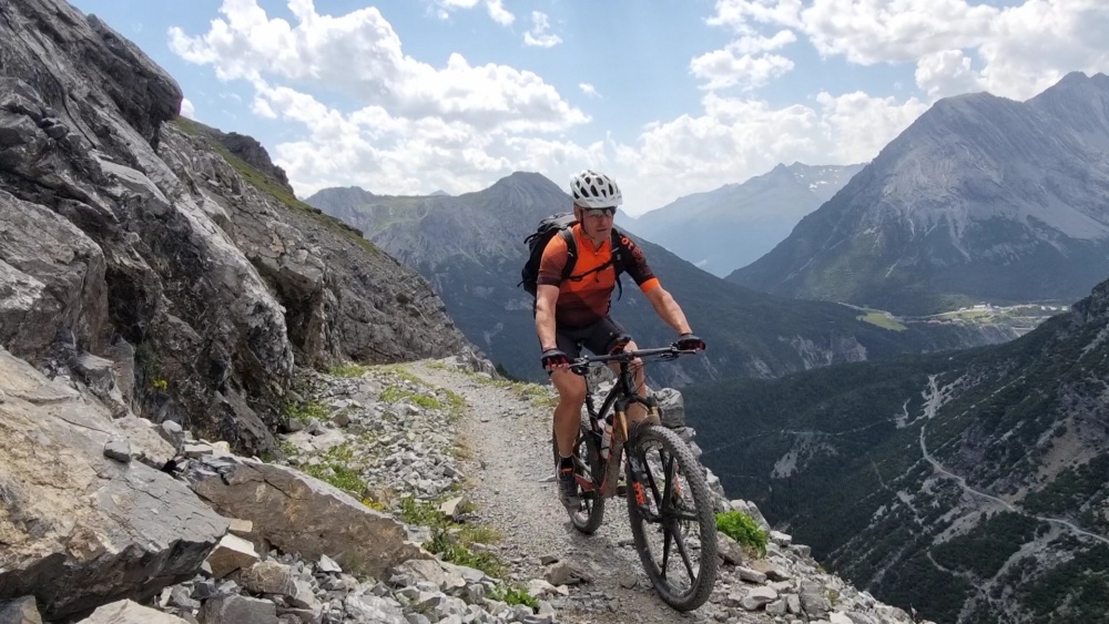 Nach dem Lago di Pian fahre und trage ich weiter hoch bis zur Forcellina di Montozzo auf 2.613m. Hinunter ins Tal ist auf der Schotterpiste die Hölle los. Massenweise eBiker und Urlauber. Hoch zum Passo di Gavia führt eine Straße, die teilweise nur einspurig ist. Entsprechend kommen sich hier die relativ wenigen Autos ins Gehege. Manchmal geht gar nichts mehr. Oben am Pass fahre ich noch ein paar Meter die alte Militärstraße hoch und dann runter ins Tal nach Santa Caterina