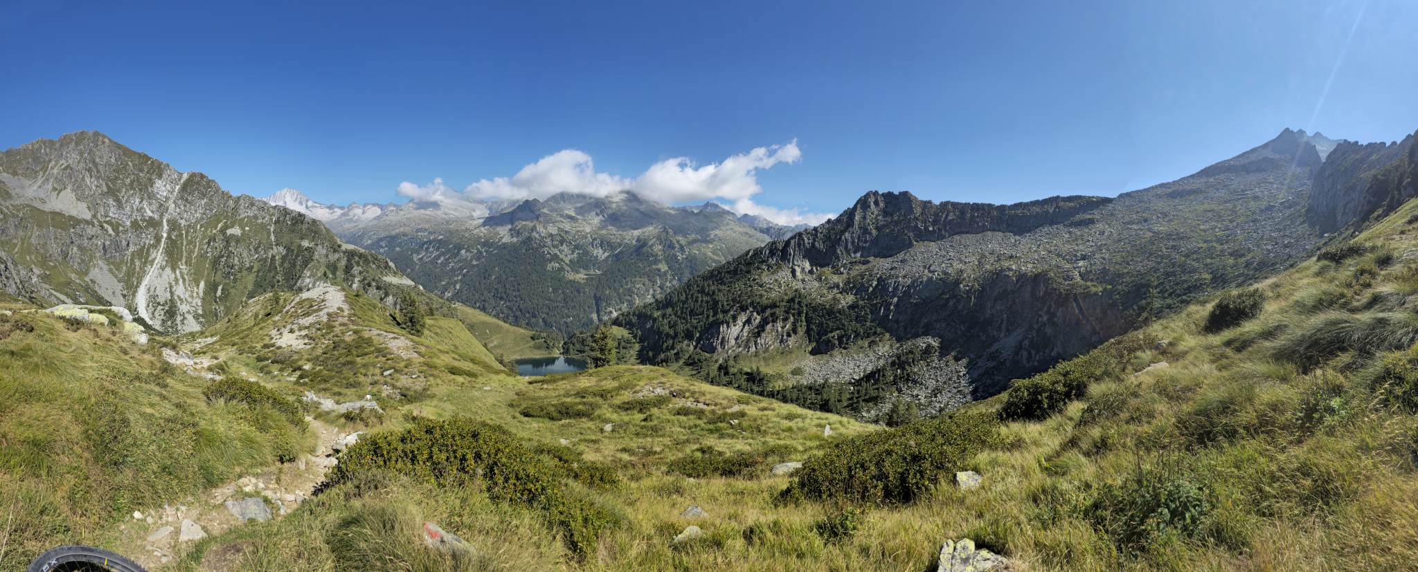 Morgens geht es zunächst auf Straße und Radwegen bis zum Lago di Malga Bissina. Dann ist Wandertag. Hochtragen, runter fahren und schieben. Wahrscheinlich wäre es besser gewesen, zum Lago D'Arno hinunterzufahren. Einen richtige fahrbarer Überquerung in Richtung Edolo scheint es aber nicht zu geben.