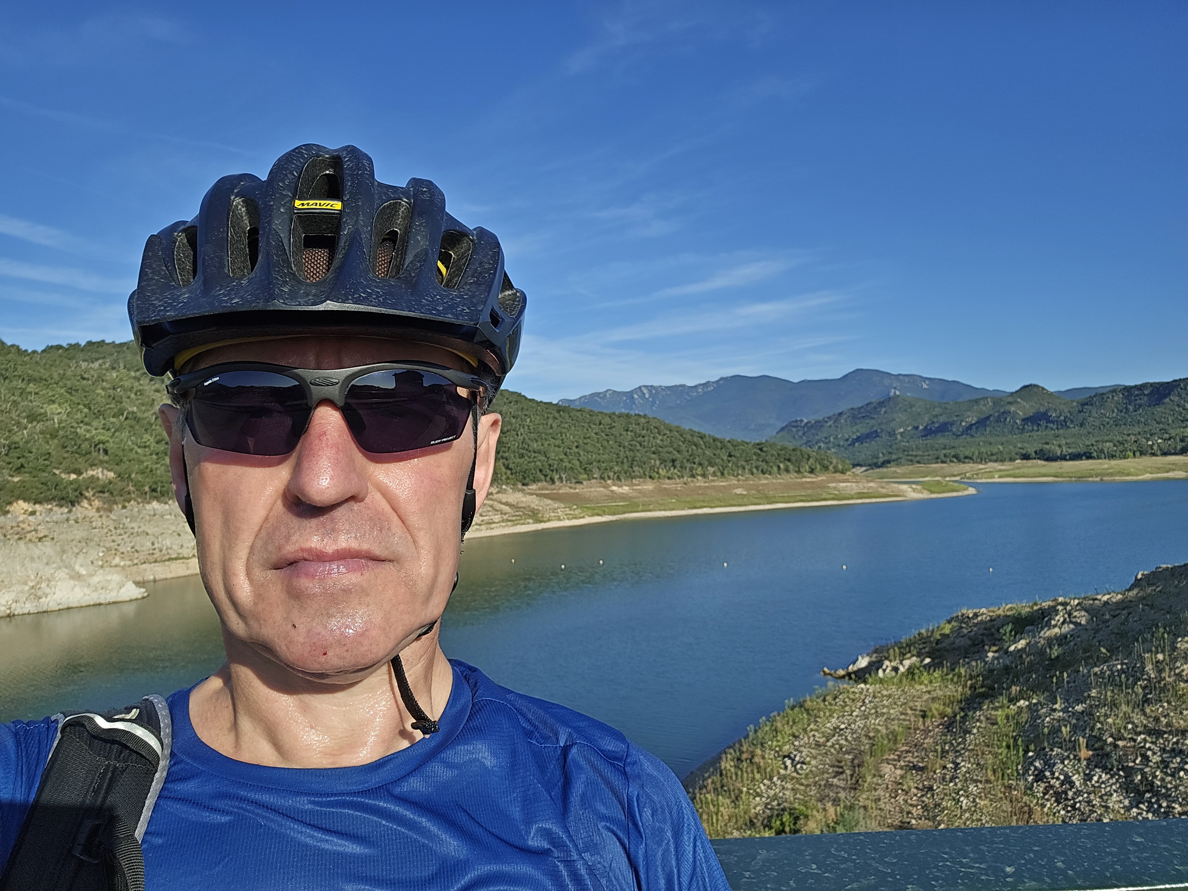 Über den großen Stausee Pantà de Boadella fahre ich an einem heißen Tag weiter in die Pyrenäen. Leider wird es immer heißer und alle Quellen und Brunnen sind ausgetrocknet. Zum Glück verkauft dann eine ältere Frau am sonst unbewirtschafteten Refugi Lliure de Talaixà Getränke. Ich trinke 2 Liter innerhalb von 15 Minuten, über den Tag verteilt um die 10 Liter.