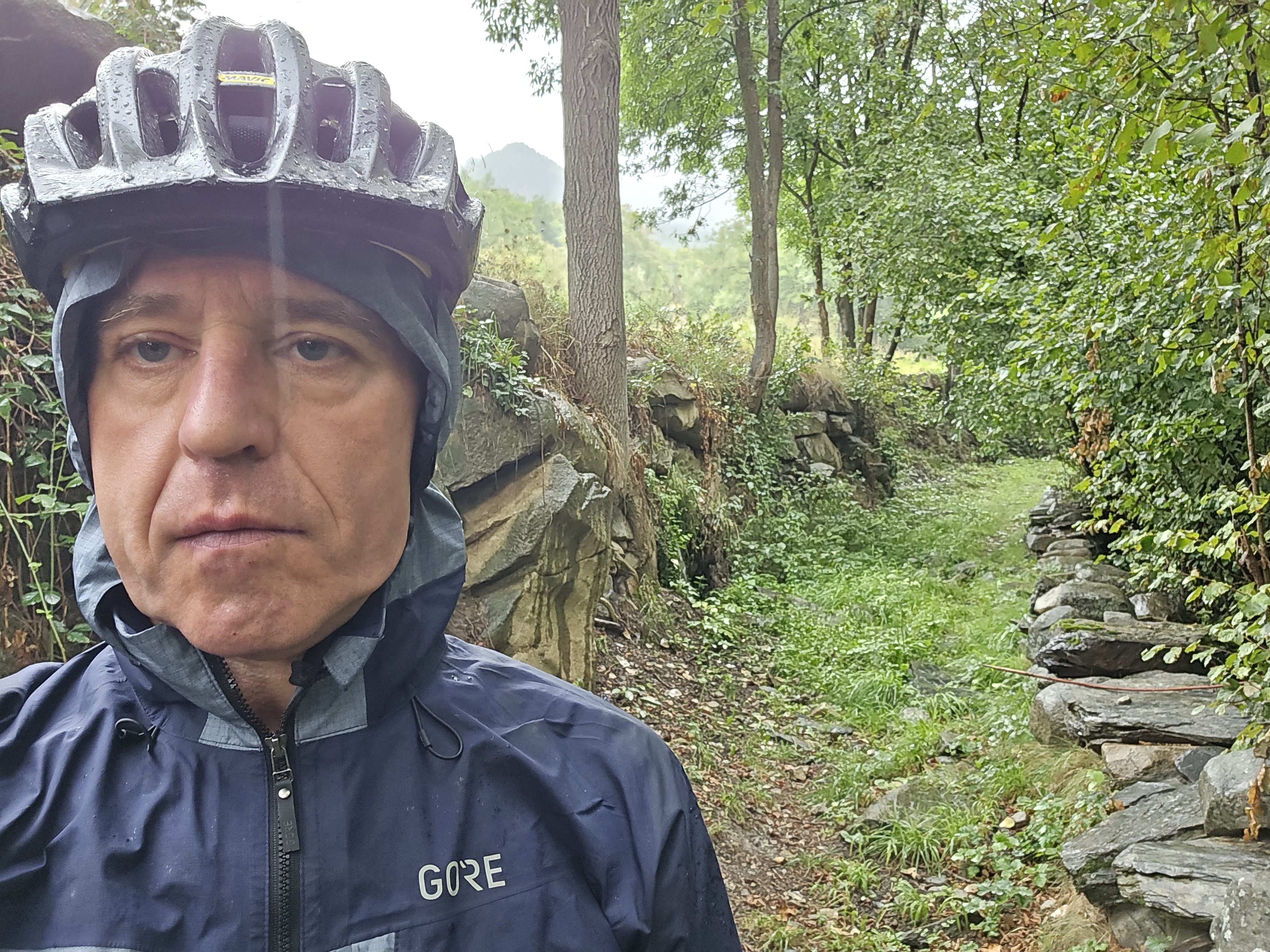 ZVormittags fahre ich locker auf einer Nebenstraße, Nachmittags wird es dann auf einer Mountainbike-Strecke ziemlich schlammig und schwierig.
