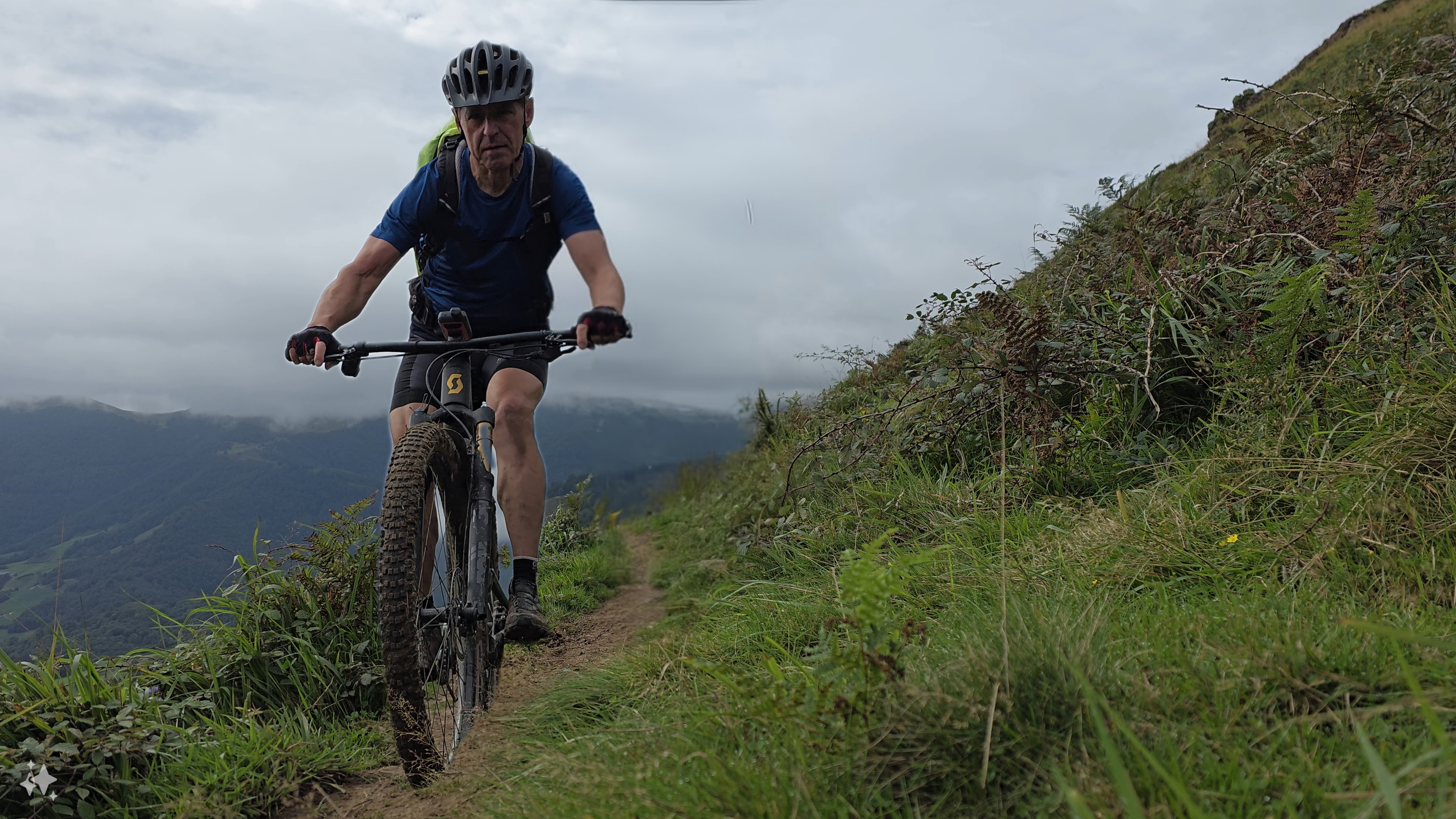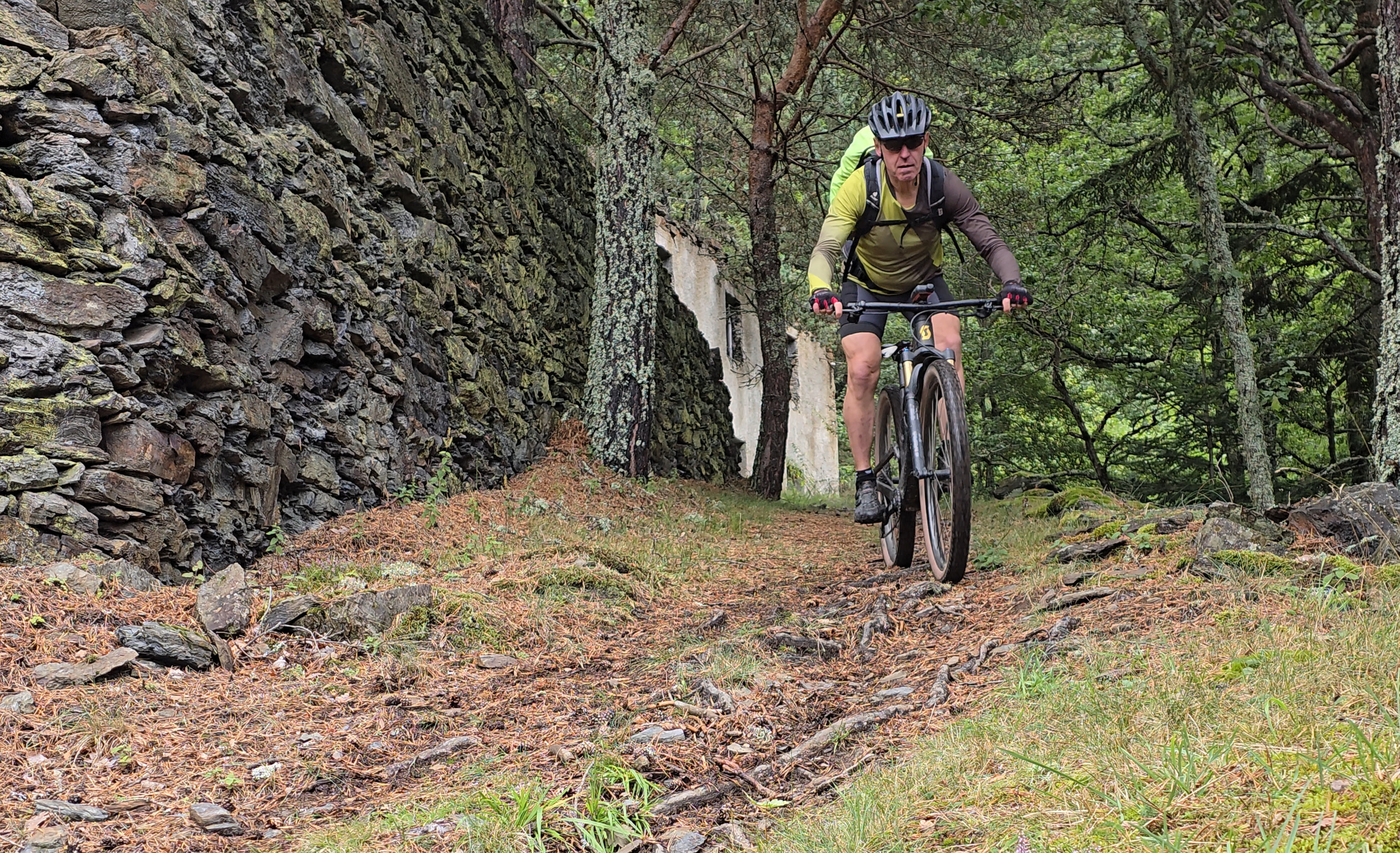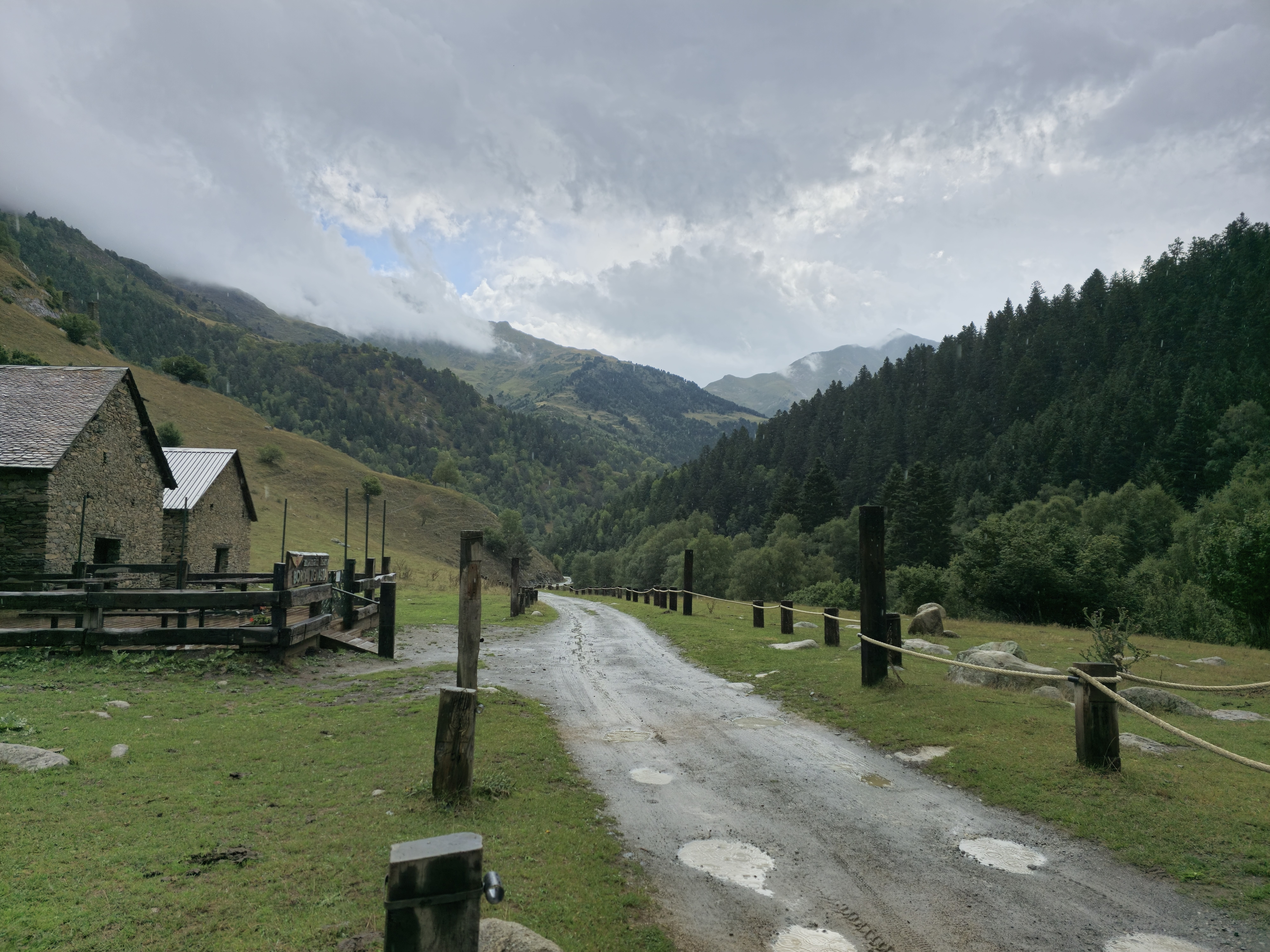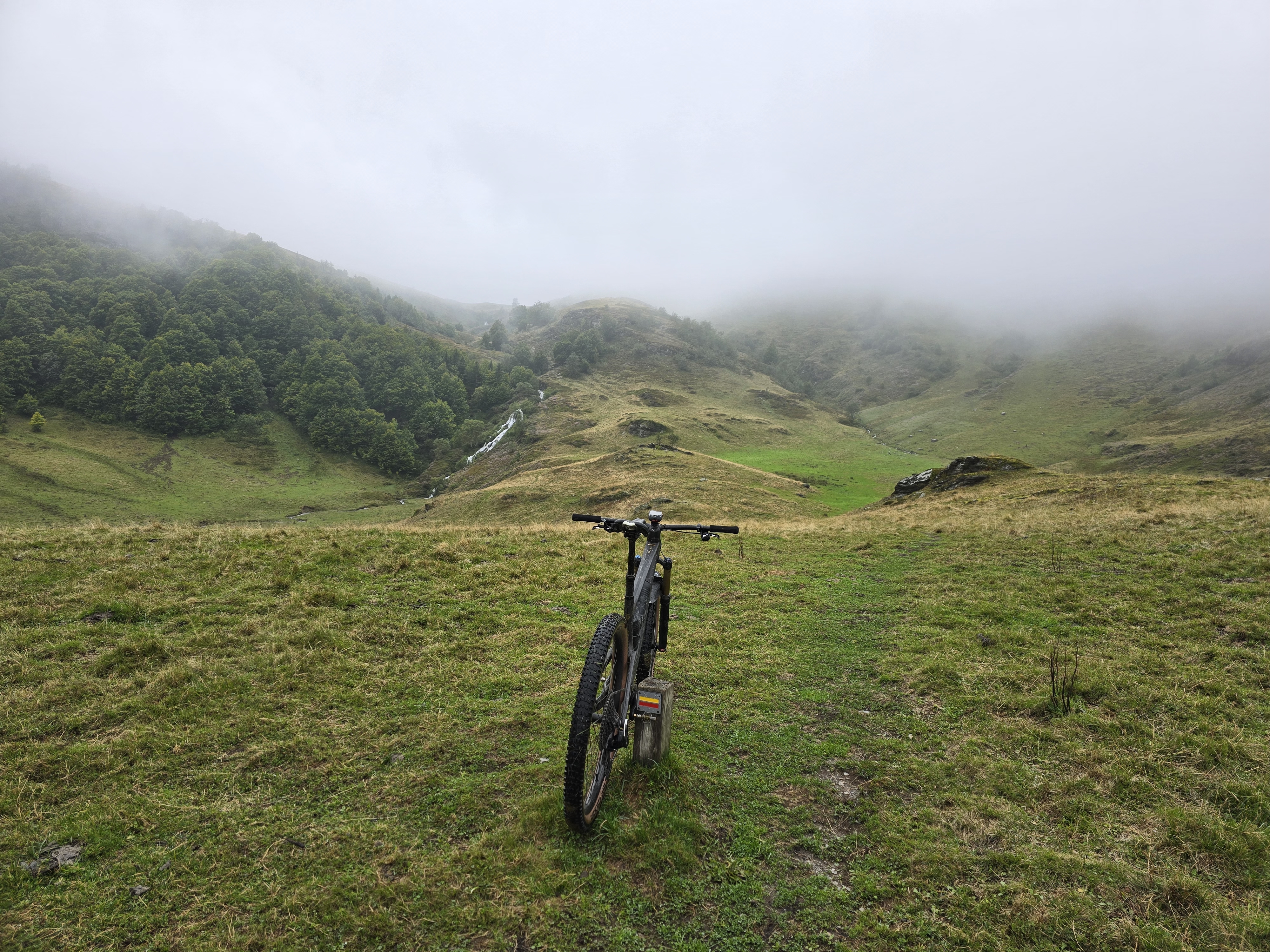 Von Andorra aus fahre ich zunächst auf der Straße, dann wird der Weg immer schwieriger und ich muss bis zum Collada Montaner schieben. Oben hört der Regen für eine kleine Pause auf. Nachmittags wird es zum Glück auch etwas besser, ich muss dann auf dem Weg ins Tal umdrehen, weil der Weg nicht weitergeht bzw. komplett zugewachsen ist.
