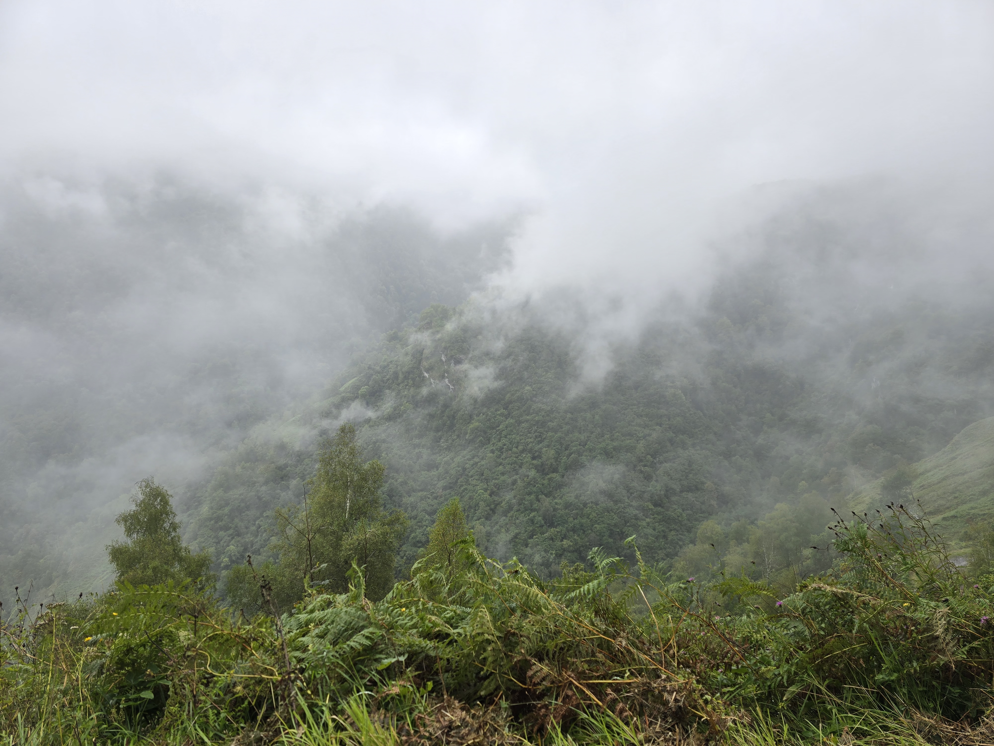Es regnet wieder und wird in der Höhe bei Wind und Wetter eisigkalt. Ich kürze deshalb Nachmittags über die Straße und das Tal ab.